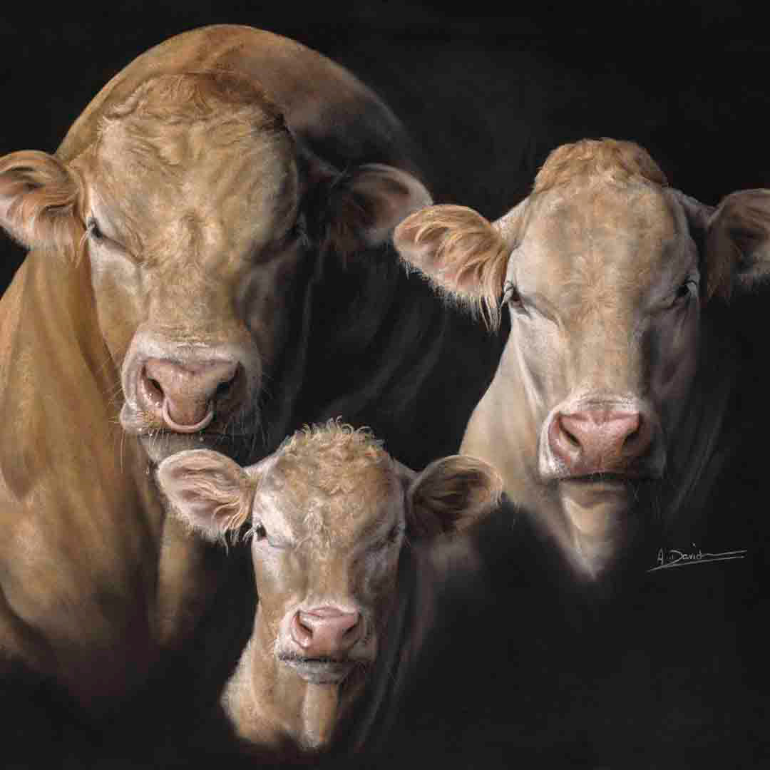 Here, in Angela Davidson's Cattle Gallery, fine art takes the shape of cows, bulls and calves. Some of Angela's Fine Art Cattle prints are now increasing sought after. Within her art, Angela manages to capture both the power of the bull and the more gentle moments between cow and calf. This gallery is a celebration of cow art: the rustic charm, power and beauty of something most country folk see every day: cattle in a field.