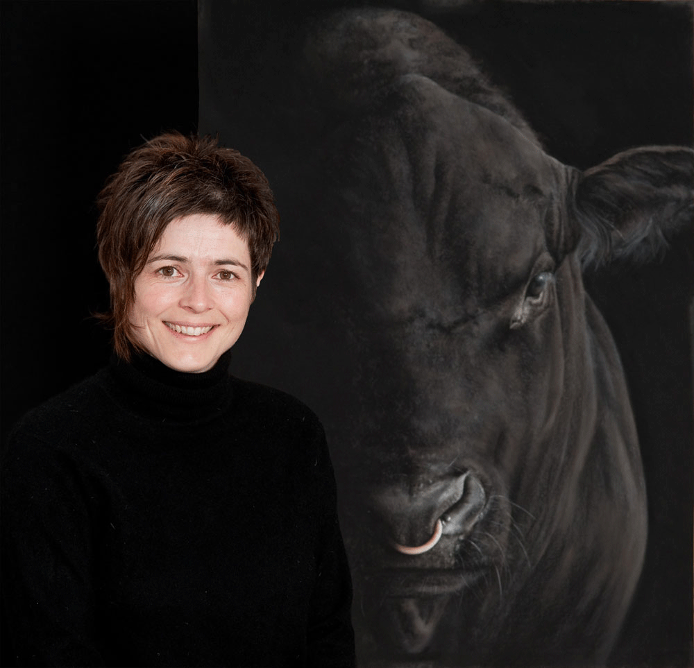 Located in rural Aberdeenshire near the quaint village of Insch, Angela's journey into the world of cattle art began in 2002, when she began creating close-up art of cow's heads and faces. Then, in 2006, her most daring creation was born: Black on Black. This original artwork featured a black Highland bull on a black background; a style that resonated with both art enthusiasts and cattle aficionados alike. And so her signature all-black animal artistry was born.